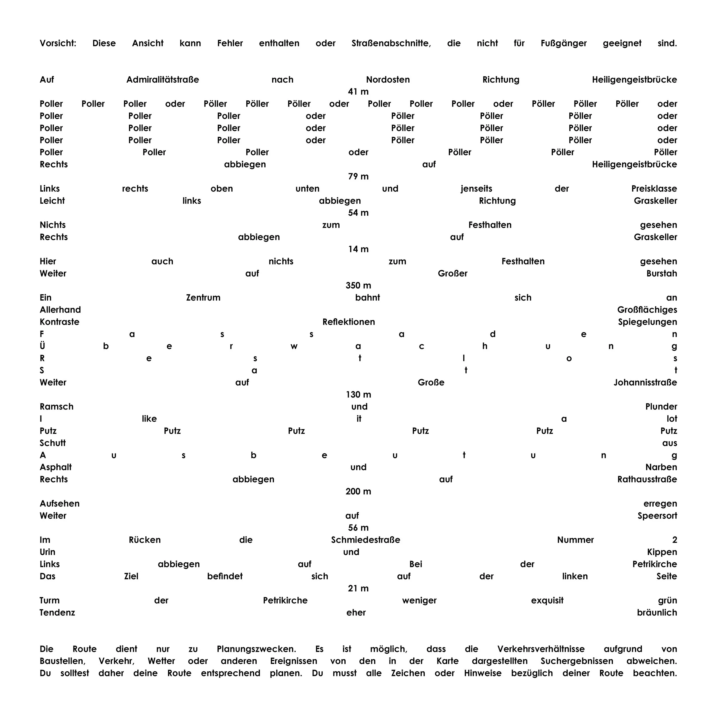 Ein Routenplaner bestimmt die Strecke vom Ausstellungsraum Westwerk zur Hamburger Petrikirche – Ein Ort den auch Samuel Beckett erwähnte und knapp in seinen Notizen beschrieb.